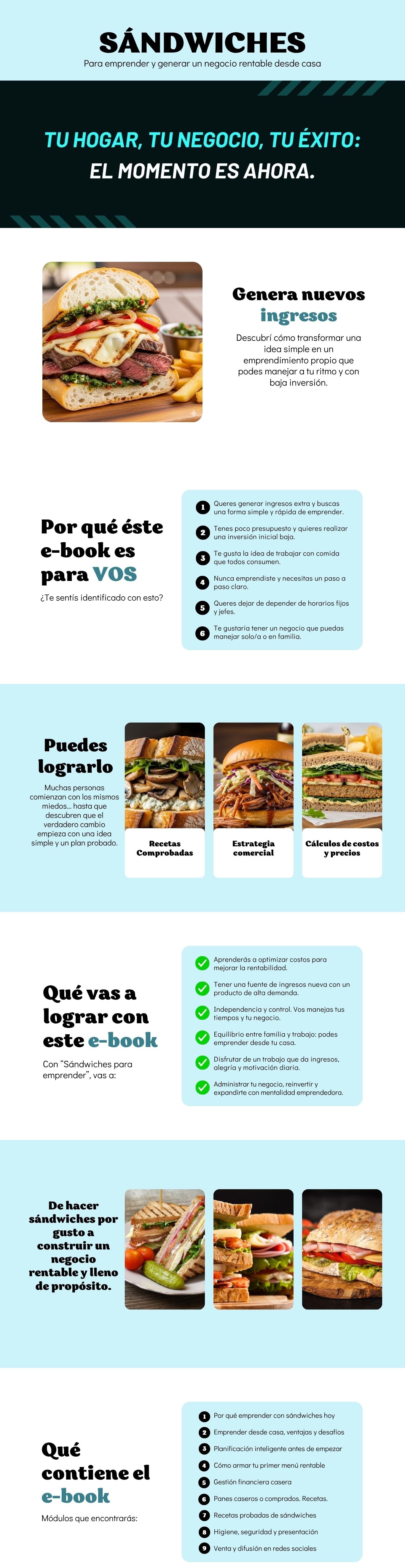 Este e-book no solo te da recetas, sino también estrategias de venta, como definir precios, organización y tips para hacer de los sándwiches un negocio real.